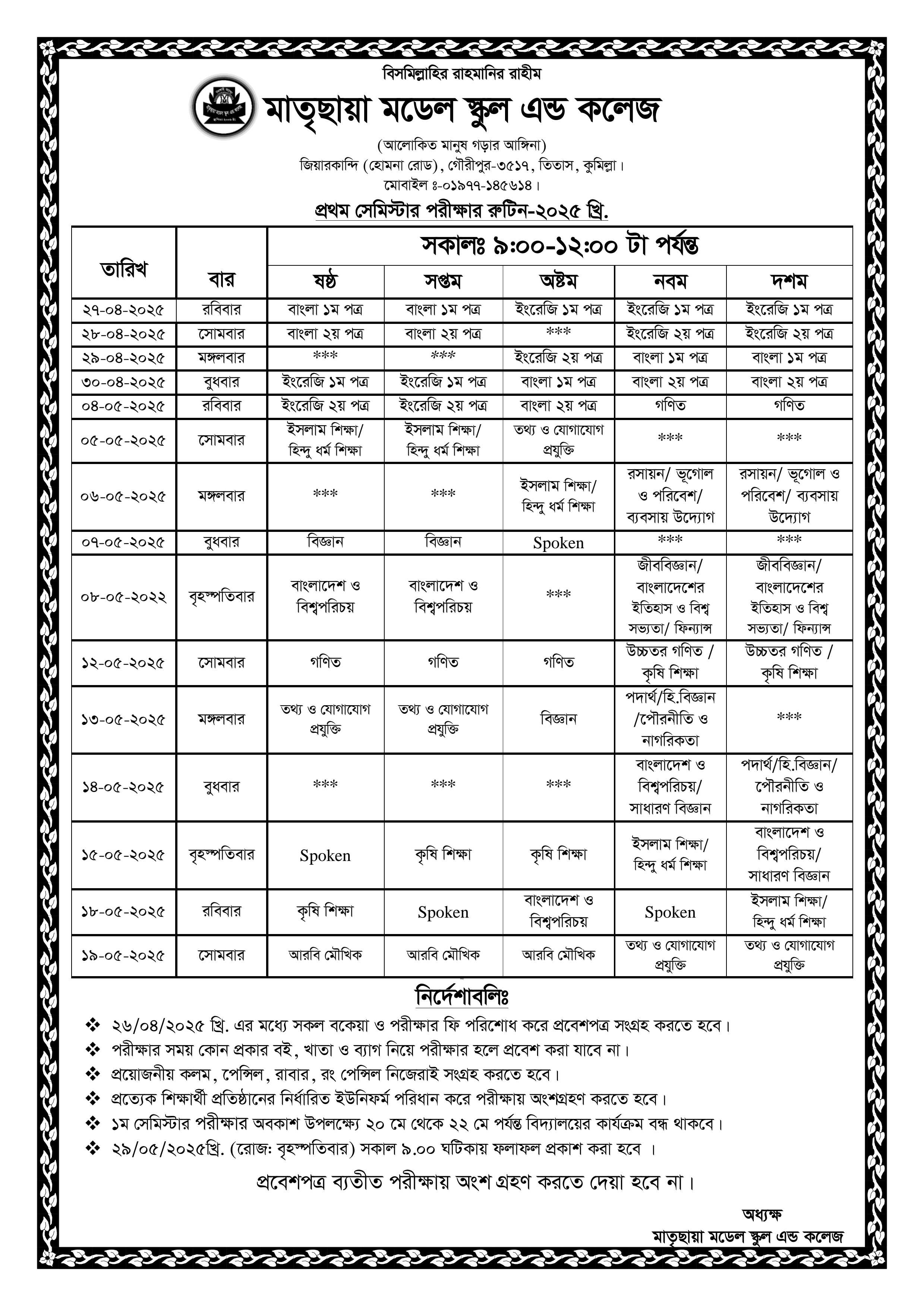 ১ম সেমিস্টার পরীক্ষা-২০২৫ এর রুটিন ( ৬ষ্ঠ থেকে ১০ম শ্রেণি)